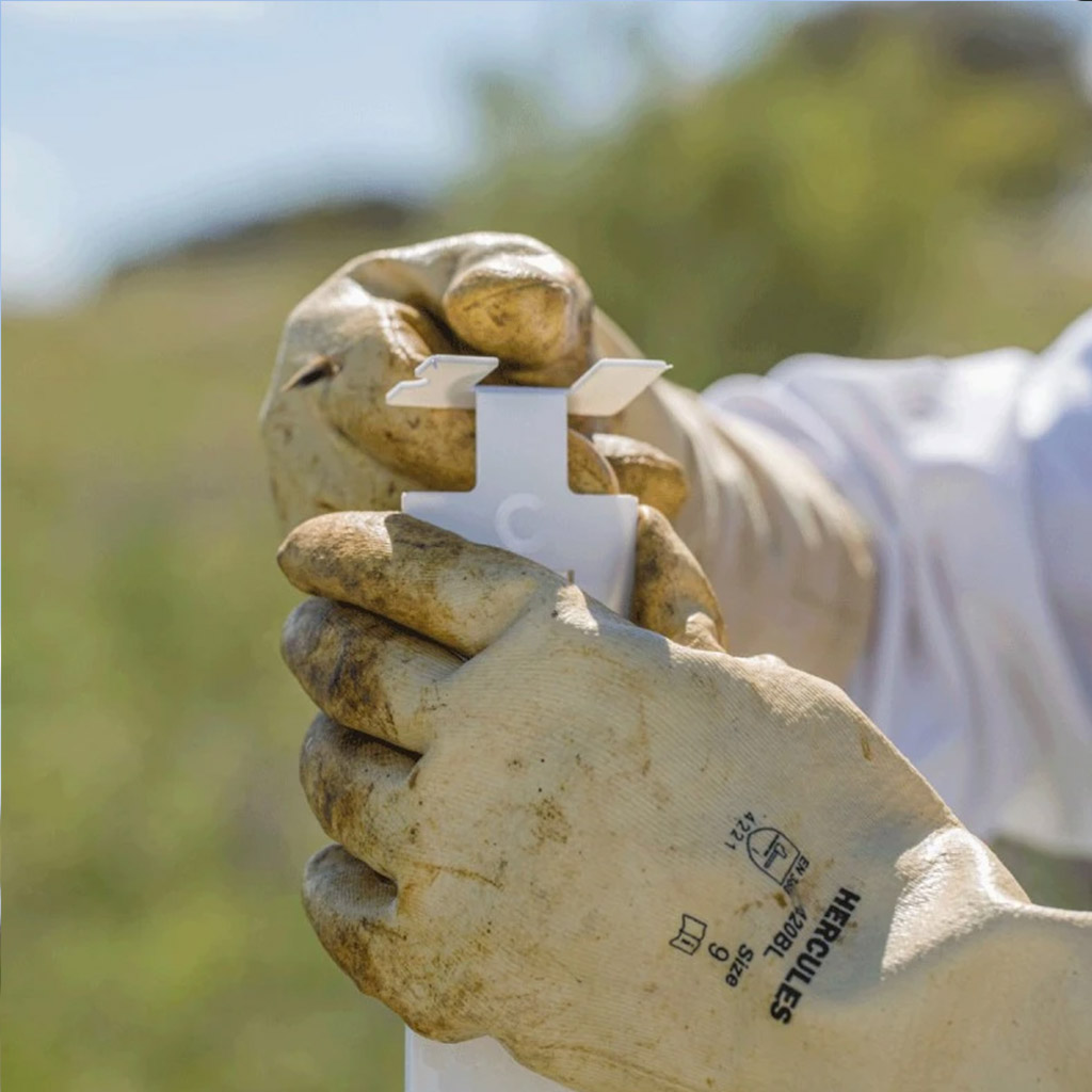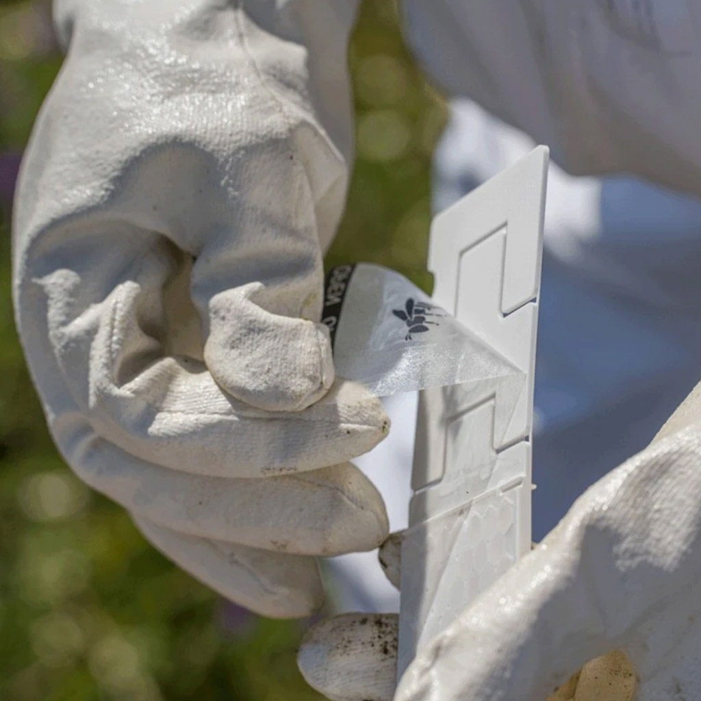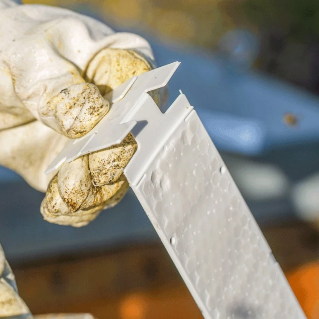 Aplikacja jest prosta nawet dla początkujących pszczelarzy. Do jednego ula (do gniazda) zawieś 2 paski w uliczkach między ramkami, najlepiej w miejscach o największej aktywności pszczół. Pasków nie skracaj ani nie przycinaj – długość dostosuj jedynie przez zgięcie zgodnie z konstrukcją ula. Pozostaw je w ulu maksymalnie na 6 tygodni.