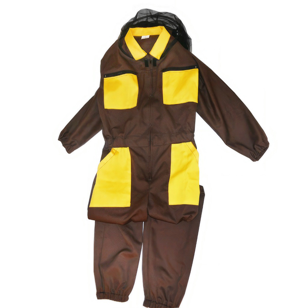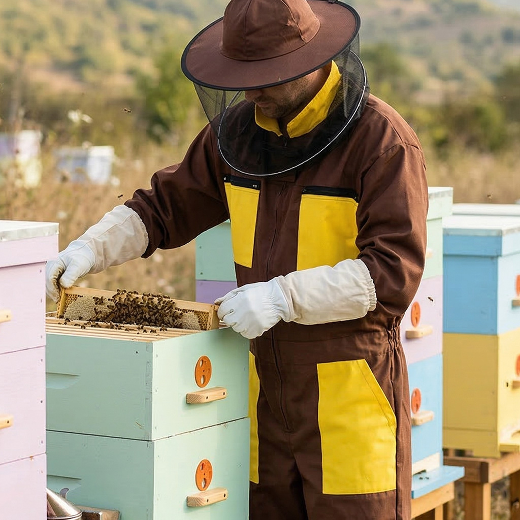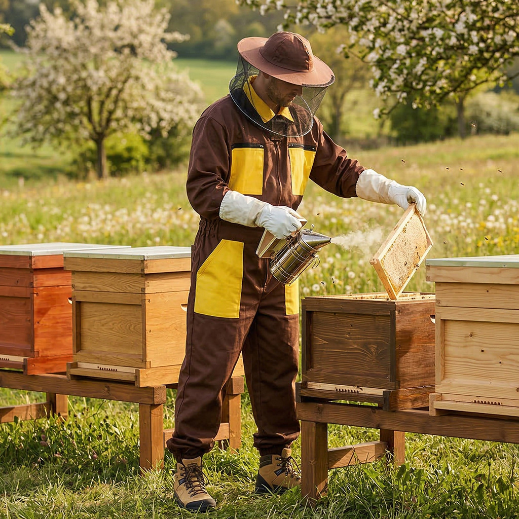 Kolorowy kombinezon pszczelarski z kapeluszem to niezawodna podstawa do spokojnej i bezpiecznej pracy przy pszczołach. Podczas przeglądów rodzin pszczelich potrzebujesz mieć wolne ręce i głowę – bez ciągłego pilnowania, skąd może nadejść użądlenie. Ta całościowa odzież ochronna została zaprojektowana tak, aby chronić od głowy do stóp, jednocześnie nie ograniczając ruchów przy manipulacji ramkami, nadstawkami ani przy pracy na pasiece. Brązowo-żółte wykonanie wygląda naturalnie i dobrze wpisuje się w otoczenie stanowiska.