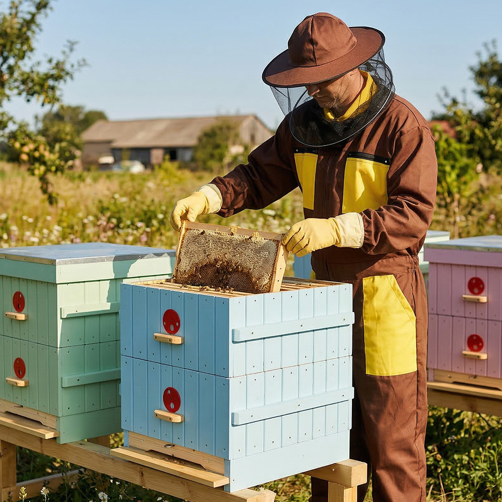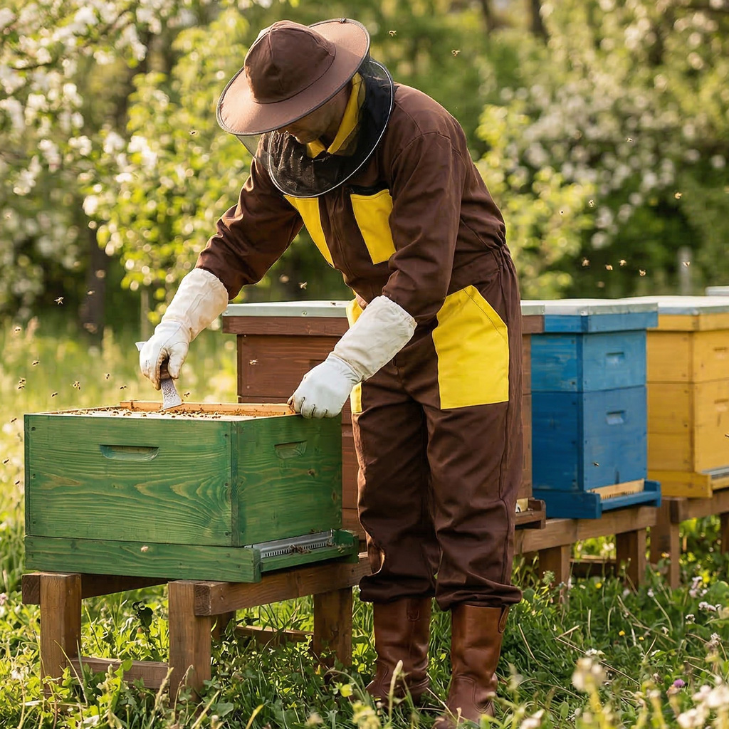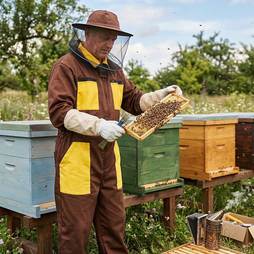 Kolorowy kombinezon pszczelarski z kapeluszem to niezawodna podstawa do spokojnej i bezpiecznej pracy przy pszczołach. Podczas przeglądów rodzin pszczelich potrzebujesz mieć wolne ręce i głowę – bez ciągłego pilnowania, skąd może nadejść użądlenie. Ta całościowa odzież ochronna została zaprojektowana tak, aby chronić od głowy do stóp, jednocześnie nie ograniczając ruchów przy manipulacji ramkami, nadstawkami ani przy pracy na pasiece. Brązowo-żółte wykonanie wygląda naturalnie i dobrze wpisuje się w otoczenie stanowiska.