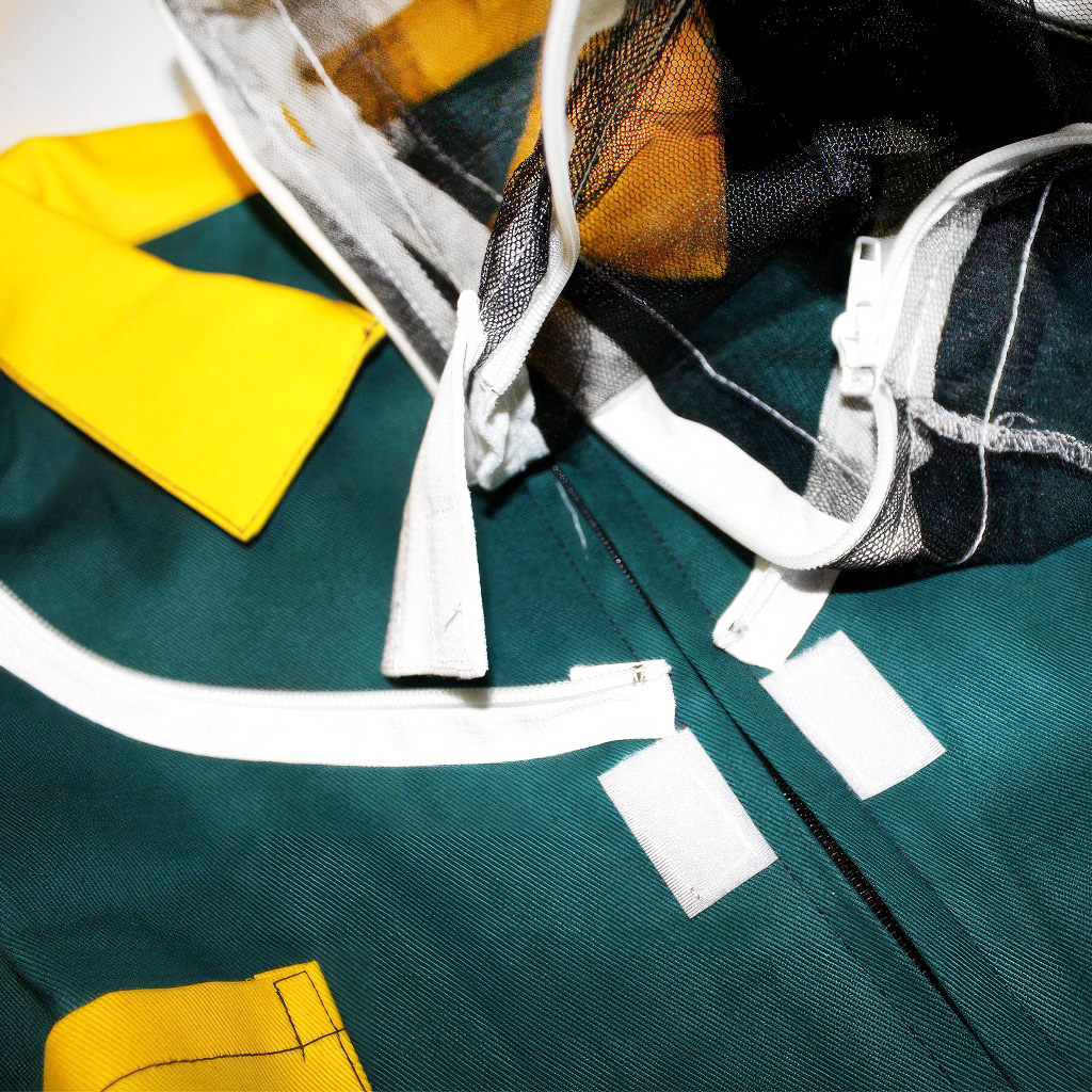 Kombinezon wykonany jest z wysokiej jakości grubszej tkaniny bawełnianej. Bawełna jest popularna w pszczelarstwie dzięki swojej przewiewności, co docenisz szczególnie w ciepłe dni, a jednocześnie dzięki wyższej gramaturze dobrze chroni przed przeniknięciem żądła. Kapelusz chroni głowę i twarz i jest połączony z bluzą za pomocą suwaka. Jest to praktyczne podczas przerwy, przemieszczania się między stanowiskami lub zawsze, gdy potrzebujesz szybko odpiąć lub odchylić kapelusz, bez konieczności zdejmowania całego ubrania.