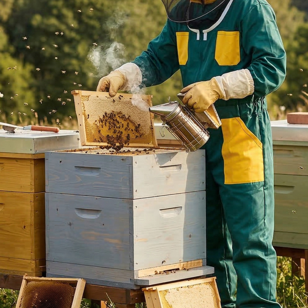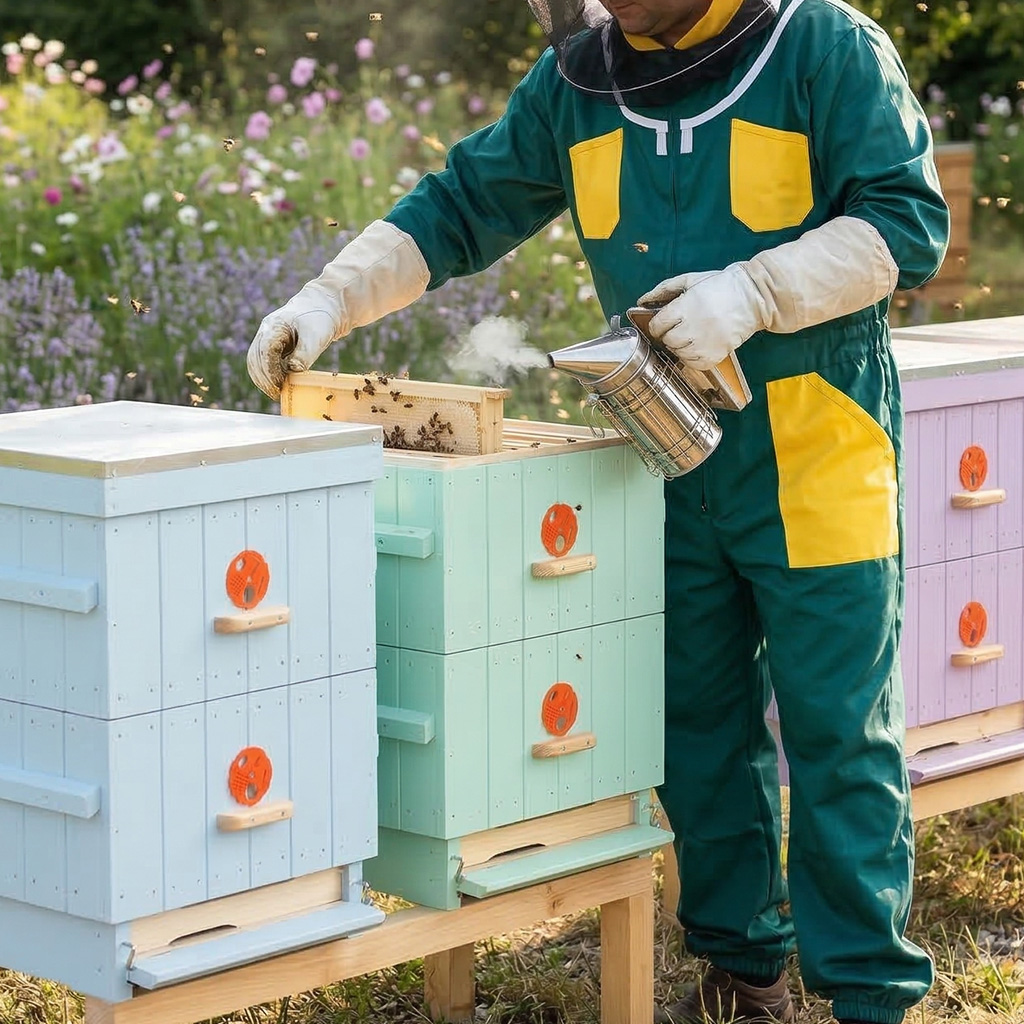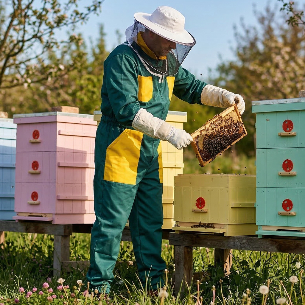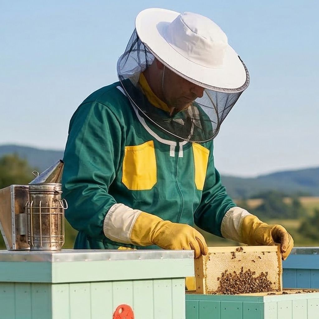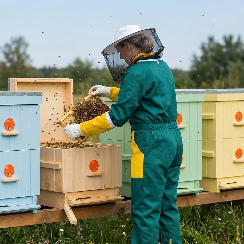 Kombinezon pszczelarski ze zintegrowanym kapeluszem należy do podstawowych środków ochronnych zapewniających spokojną i bezpieczną pracę przy pszczołach. Podczas przeglądów rodzin pszczelich, tworzenia odłóków lub odmiedzania miodu ważne jest, aby mieć wolne ręce, skupić się na pracy i nie myśleć o każdym możliwym użądleniu. Ten zielono-żółty kombinezon osłania całe ciało i jest uszyty z wytrzymałego materiału, który tworzy niezawodną barierę przed żądłami. Naturalne zielono-żółte zabarwienie dodatkowo działa na pszczoły mniej drażniąco niż ciemne odcienie i pomaga utrzymać spokój na pasiece.