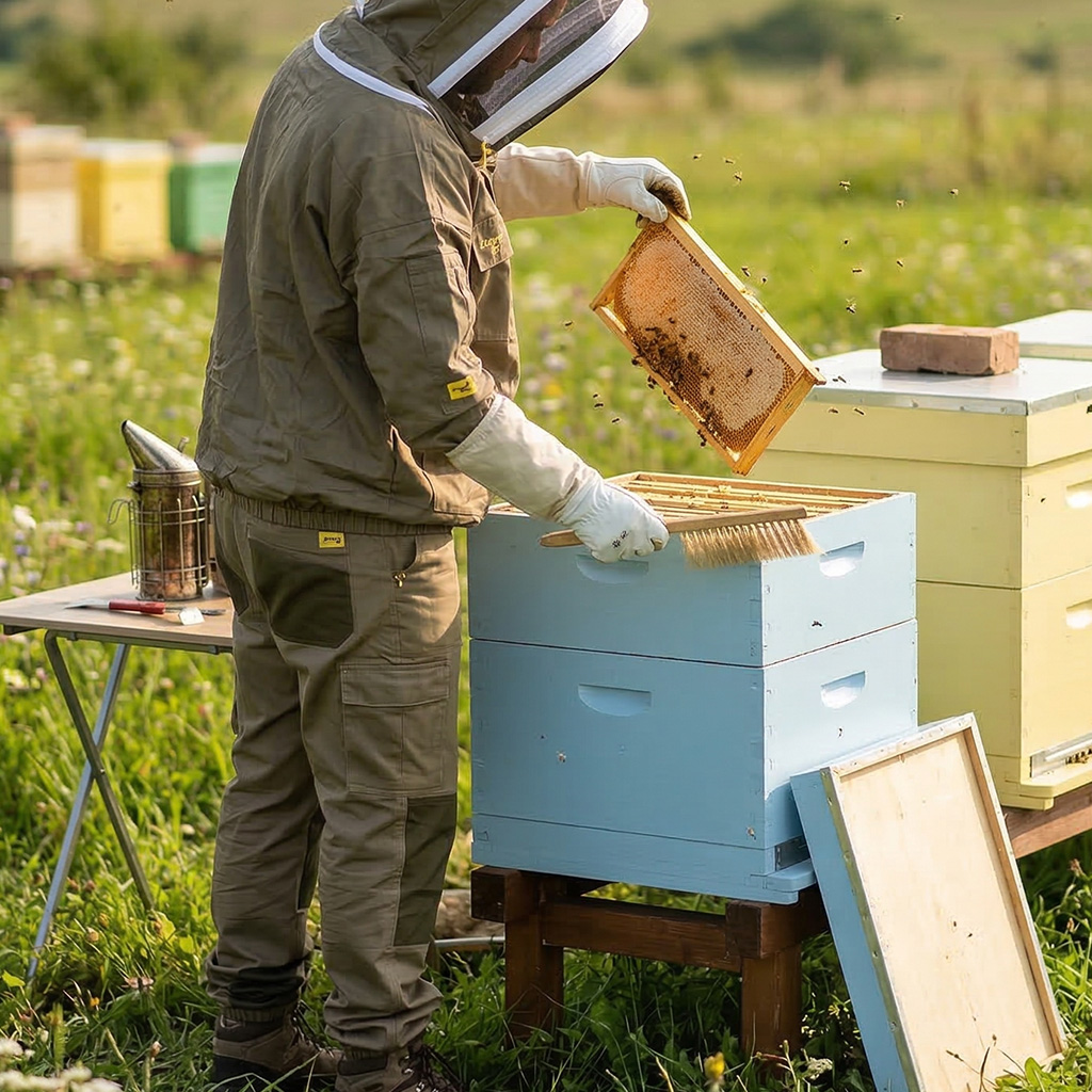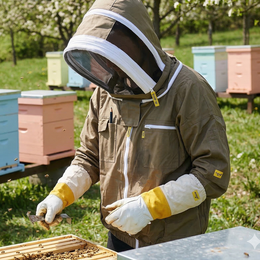 Bluza pszczelarska z kapeluszem do codziennego użytku na pasiece. Te bluzy posiadają wiele ulepszeń i należą do najlepszych produktów, które możemy Państwu zaoferować. Praktyczny odcień ciemnego khaki, w rozmiarach od S do XXXXL. Wykonana z wytrzymałych materiałów, które chronią przed użądleniem pszczoły.