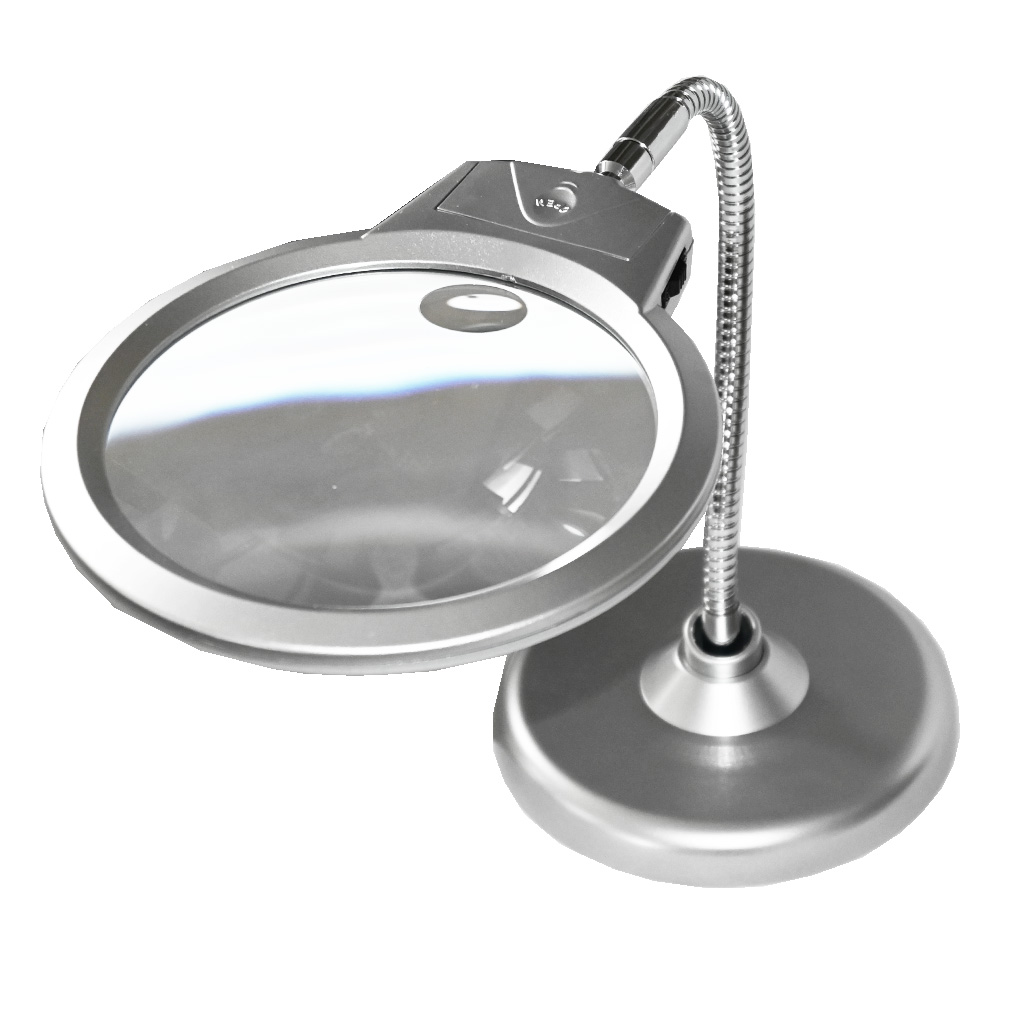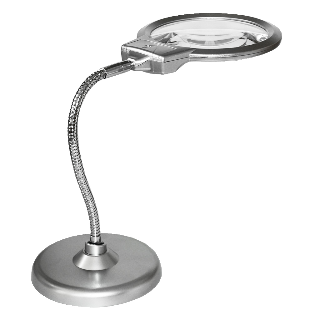 Lupa stołowa z oświetleniem LED z dwoma szkłami powiększającymi. Możliwe powiększenia to 2,25 i 5 w zależności od użytej soczewki. Lupa ma duży i solidny stojak z giętkim ramieniem, którym można ustawić kierunek i nachylenie lupy według potrzeb. Częścią lupy są dwa oświetlenia LED.