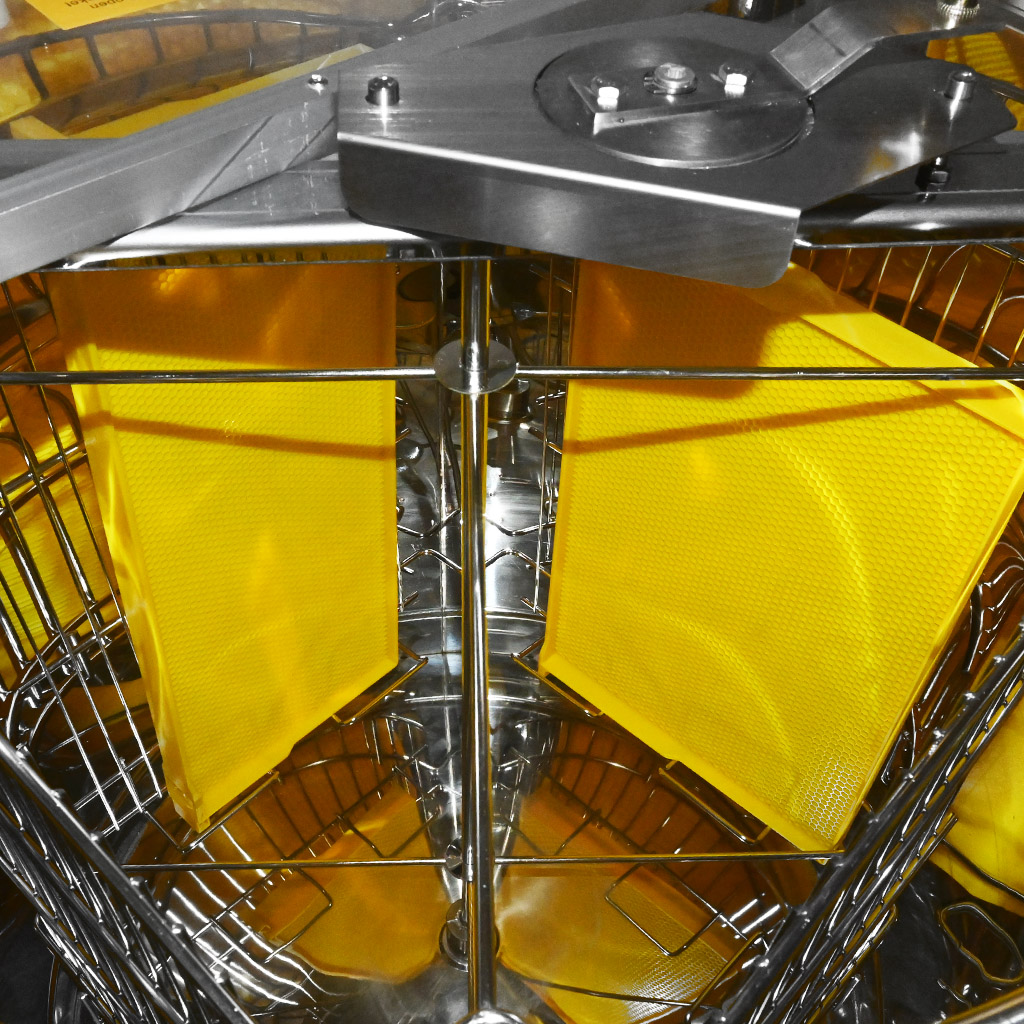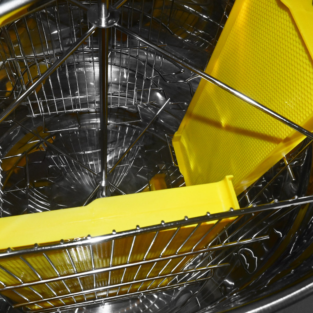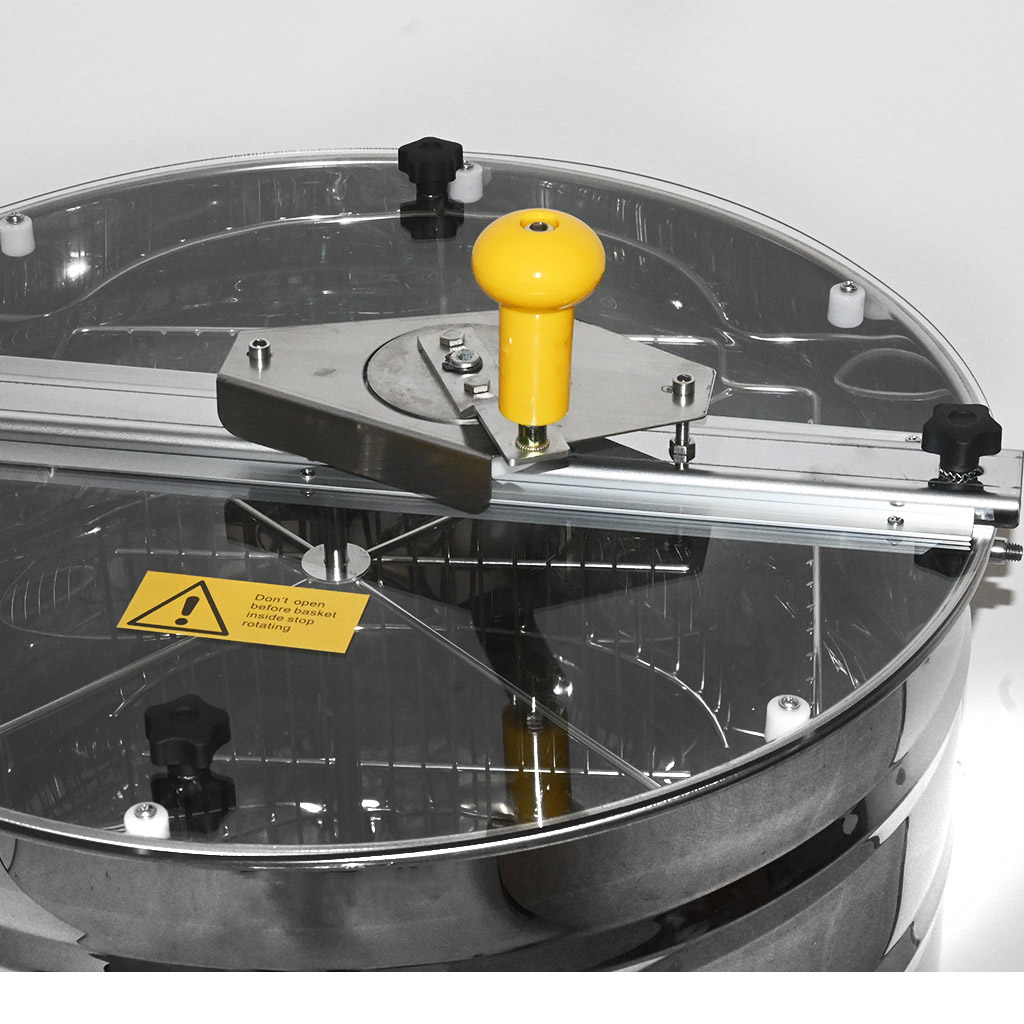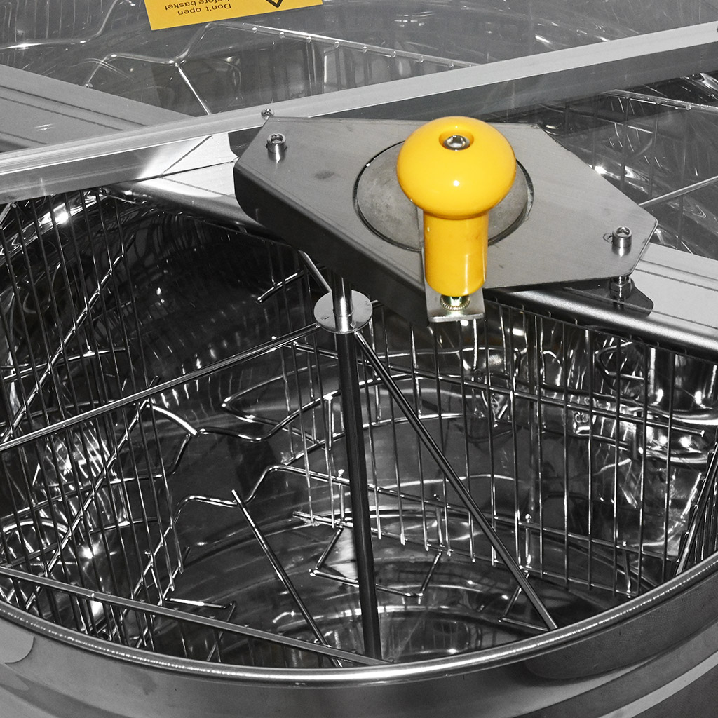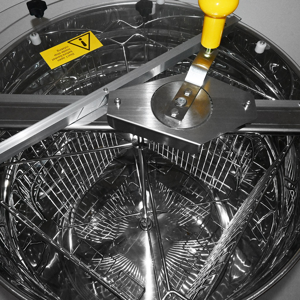 Prosty mechanizm napędu ręcznego z ergonomiczną korbą zapewnia szybkie rozkręcenie kosza miodarki. W konstrukcji z dwoma kołami zębatymi w mechanizmie wybrano idealny stosunek przekładni, tak aby miodarka dała się łatwo rozkręcić. Dzięki tej prostej konstrukcji cały napęd miodarki jest bardzo niezawodny bez konieczności zasadniczej konserwacji.