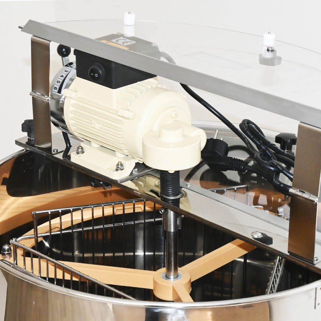 System napędu jest zawsze umieszczony w górnej części miodobrania, co zapewnia możliwość łatwej konserwacji. Dzięki temu rozwiązaniu kosz miodobrania w dolnej części jest swobodnie umieszczony na łożysku kulkowym. Napęd jest umieszczony na listwie zaciskowej, na której są jednocześnie szerokie zawiasy do pokryw z pleksiglasu. Listwa zaciskowa z napędem jest wystarczająco masywna, ponownie z polerowanego materiału nierdzewnego, dla łatwej konserwacji. Po zdjęciu górnej listwy z napędem, która jest przymocowana dwoma śrubami gwiaździstymi, można łatwo zdjąć cały napęd. Tak samo łatwo wyjmujesz cały kosz z miodobrania i możesz łatwo wyczyścić cały miodobrań i kosz osobno.