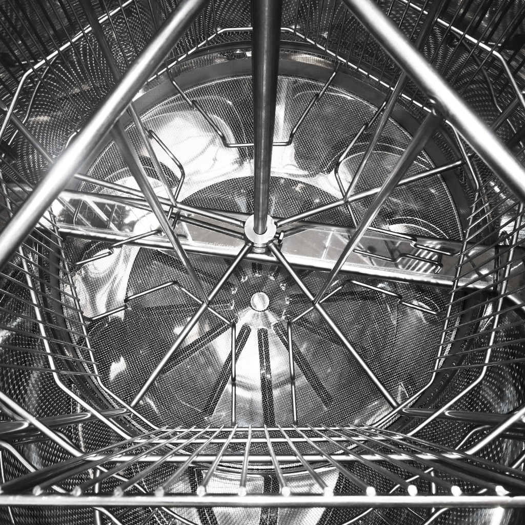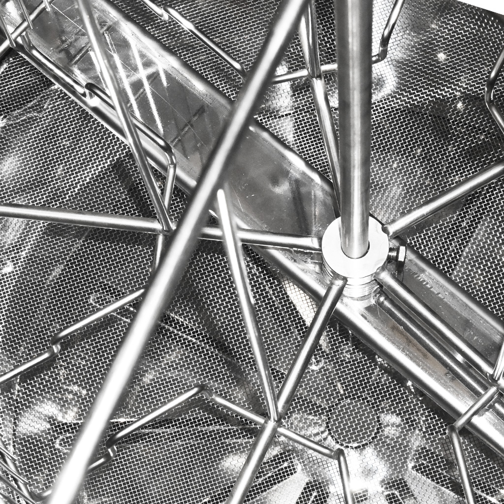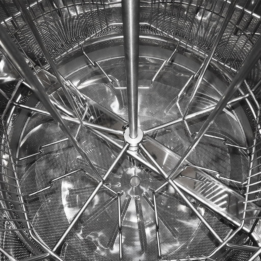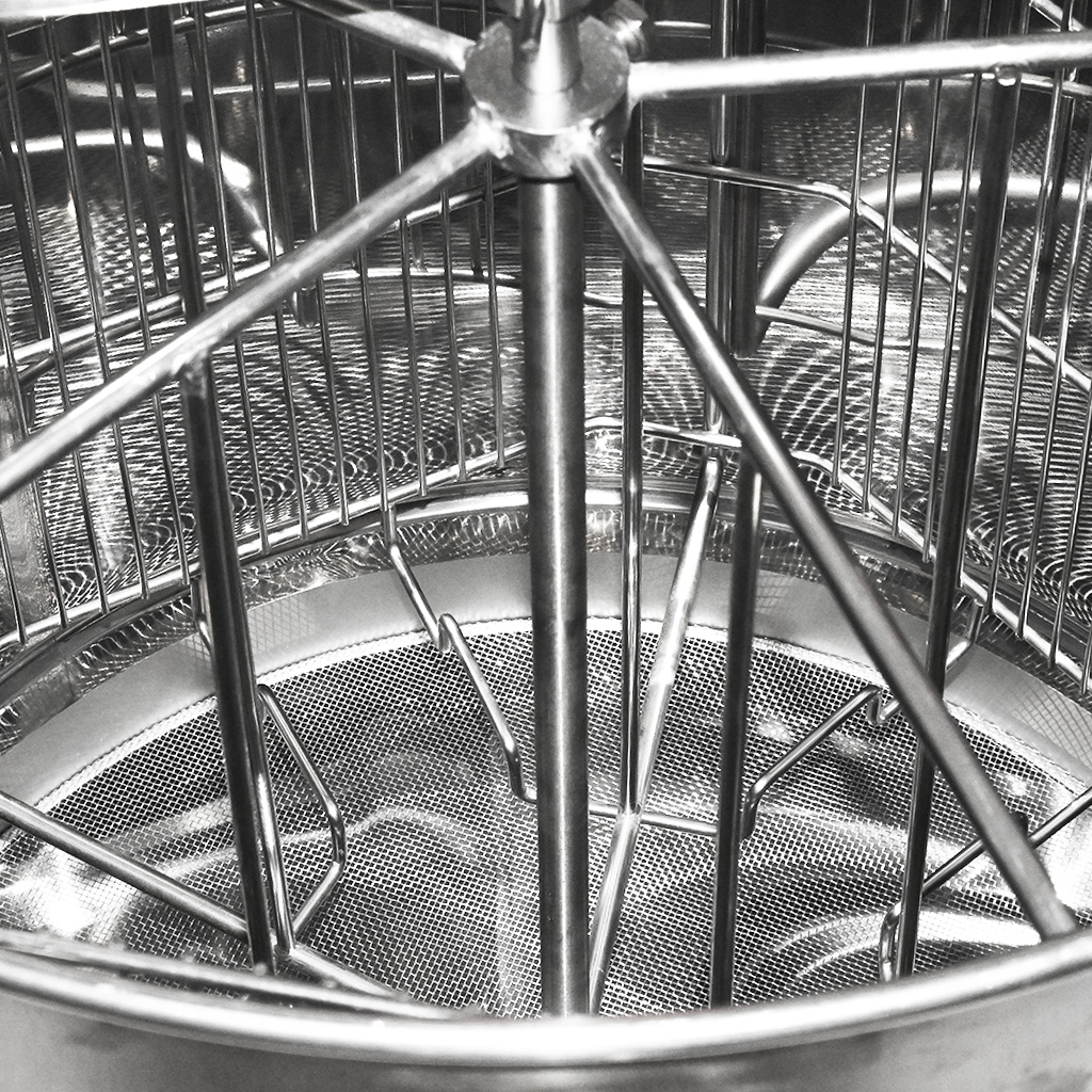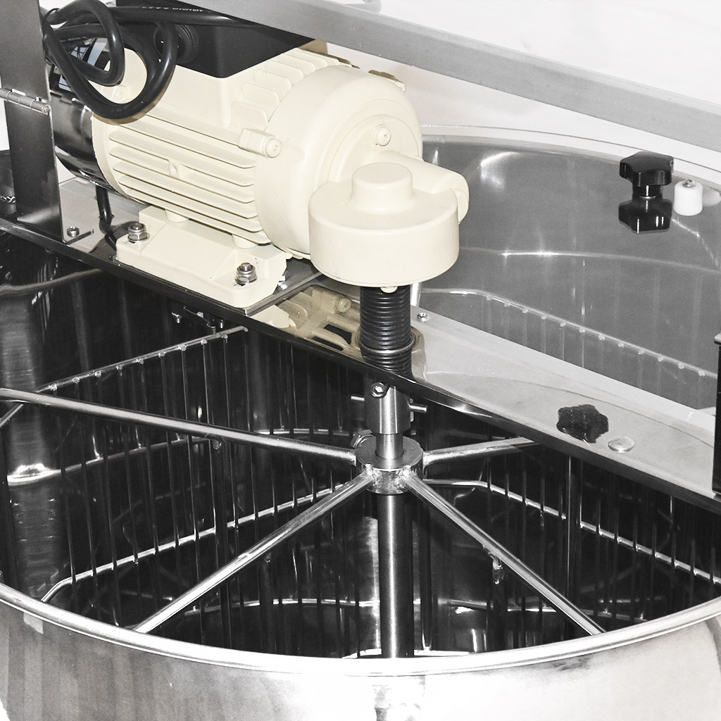 System napędu jest zawsze umieszczony w górnej części miodobrania, co zapewnia możliwość łatwej konserwacji. Dzięki temu rozwiązaniu kosz miodobrania w dolnej części jest swobodnie umieszczony na łożysku kulkowym. Napęd jest umieszczony na listwie zaciskowej, na której są jednocześnie szerokie zawiasy dla pokryw z pleksiglasu. Listwa zaciskowa z napędem jest wystarczająco masywna, ponownie z polerowanego materiału nierdzewnego, dla łatwej konserwacji. Po zdjęciu górnej listwy z napędem, która jest przymocowana dwoma śrubami gwiaździstymi, można cały napęd łatwo zdemontować. Równie łatwo wyjmujesz cały kosz z miodobrania i możesz łatwo wyczyścić cały miodobrań i kosz osobno.