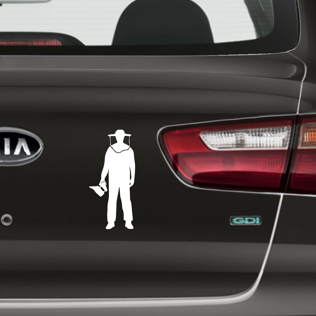 Samoprzylepny obrazek pszczelarza z dymiarką w białym wykonaniu, odpowiedni na ciemniejsze podłoża. Ta naklejka jest wykonana z wodoodpornego materiału z wysokiej jakości klejem i nadaje się również do wymagających środowisk, na przykład na samochód.
