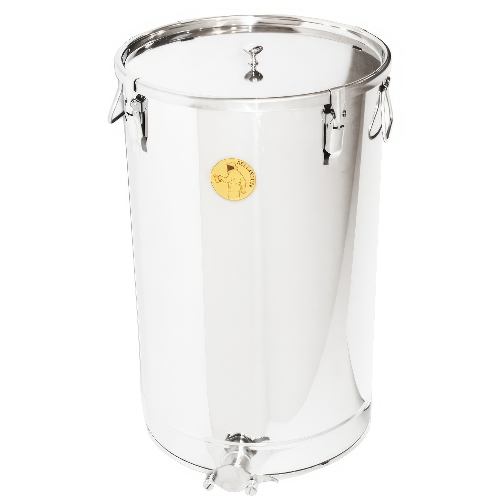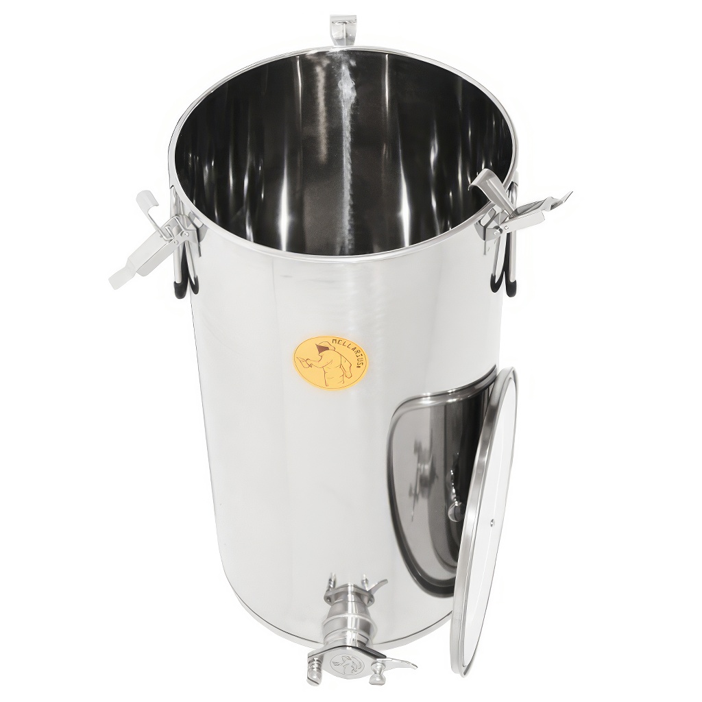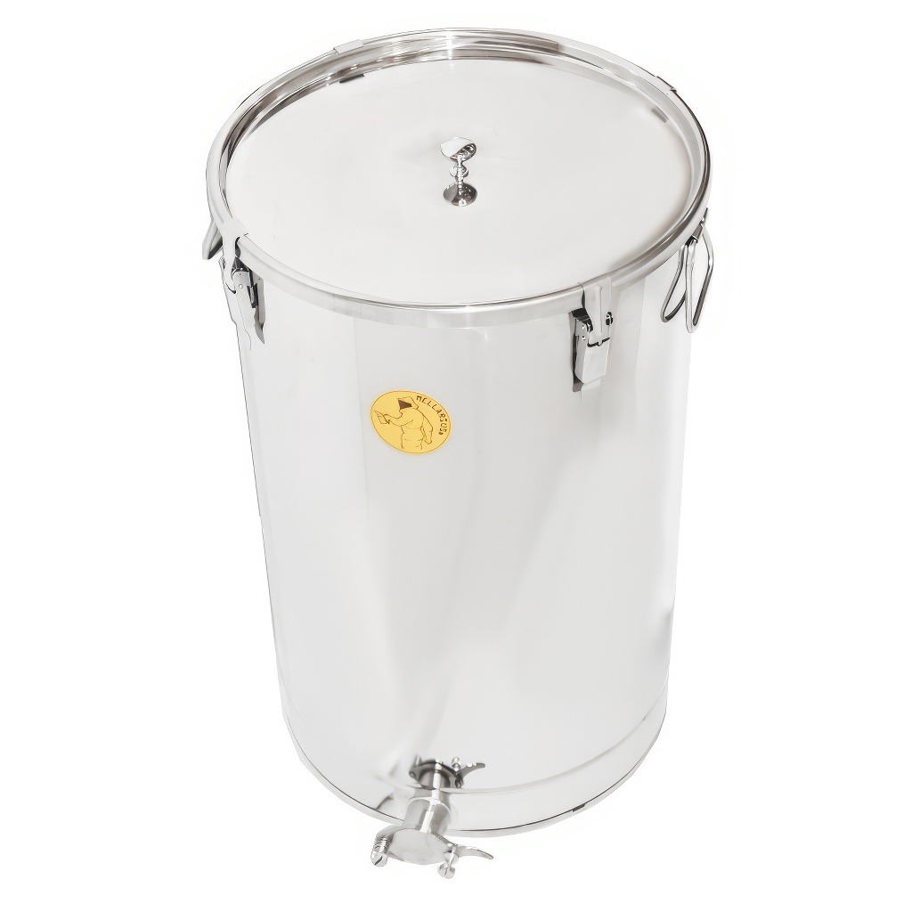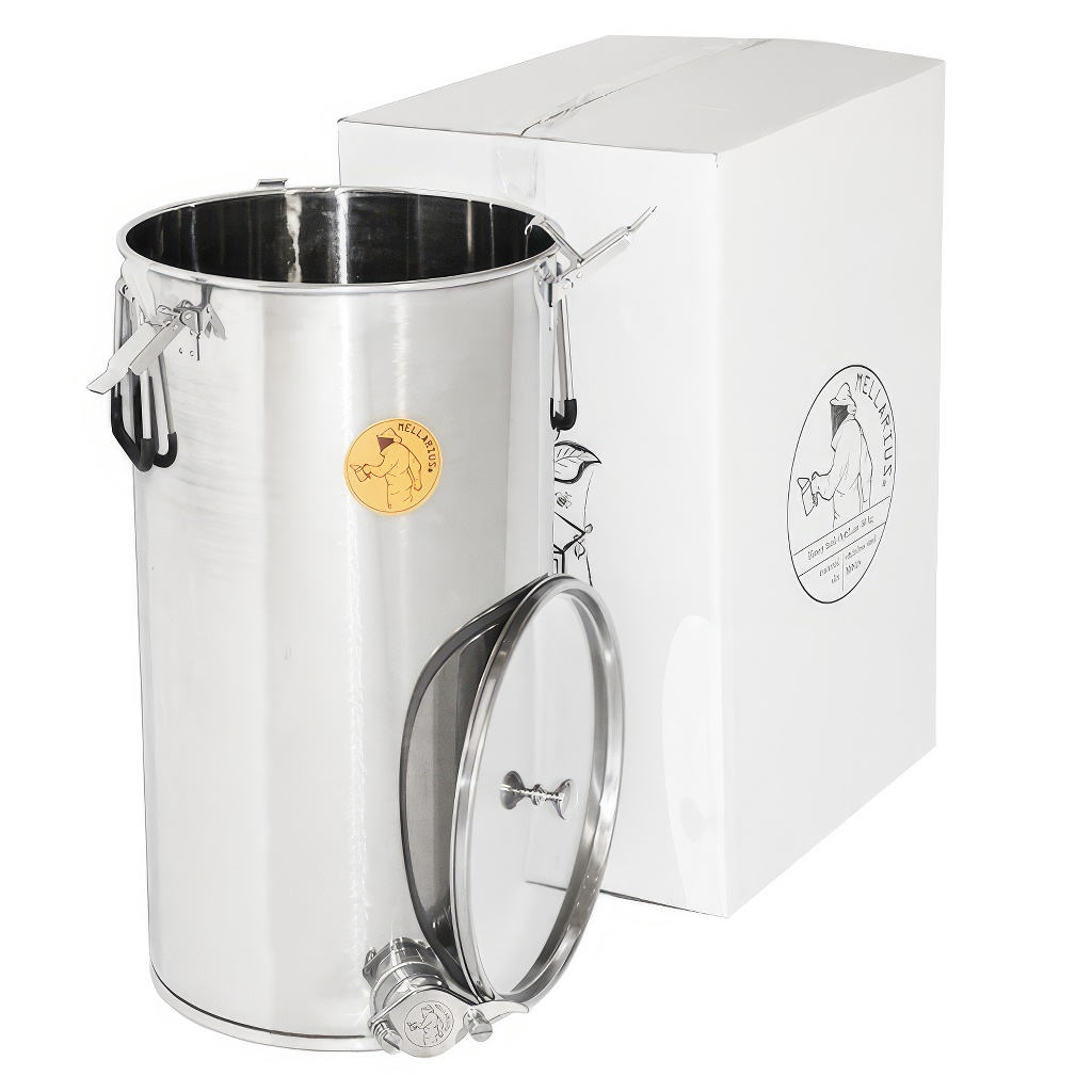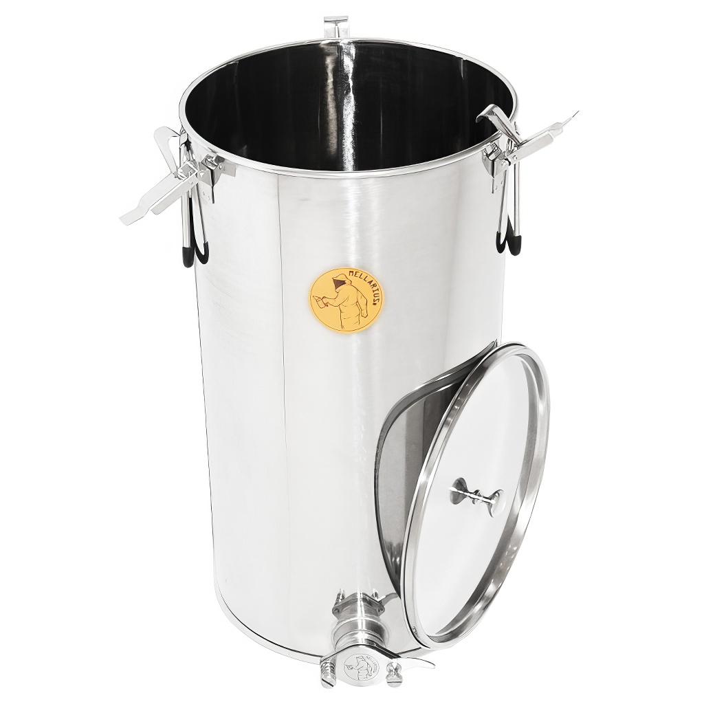 Zbiorniki na miód Mellarius w kilku wariantach, w tym przypadku z przyspawanynym kranem ze stali nierdzewnej dla maksymalnej wytrzymałości. Są wykonane z wysokiej jakości stali nierdzewnej przeznaczonej do kontaktu z żywnością o odpowiedniej grubości (0,8 do 1 mm), tak aby nie mogło dochodzić do przypadkowych wgnieceń. Wszystkie części zbiorników są starannie spawane przy użyciu spawania plazmowego. Przy konstrukcji kładziony jest nacisk na gładkie powierzchnie, które można łatwo czyścić, dlatego zbiorniki są wykonane z polerowanych blach ze stali nierdzewnej. Wszystkie nasze zbiorniki są wyposażone w uchwyty ze stali nierdzewnej dla łatwego przenoszenia.