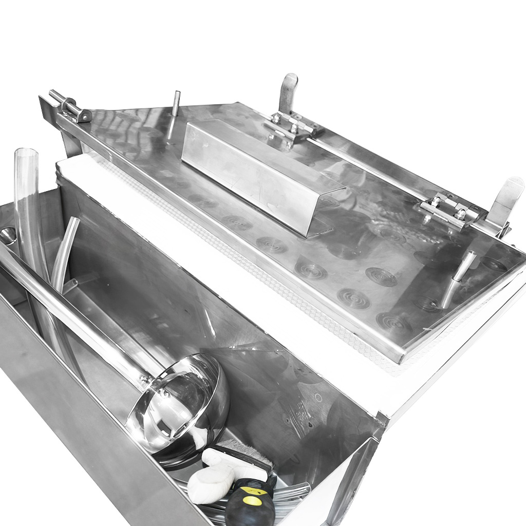 Prasa dostarczana jest jako kompletny zestaw do natychmiastowego zastosowania. W opakowaniu znajdziesz szpachlę nierdzewną do wygodnego wyrównywania brzegów węz, chochlę do precyzyjnego dozowania wosku, pędzel oraz węże potrzebne do podłączenia obiegu chłodzącego. Nie musisz nic dokupować – wystarczy przygotować wosk i możesz zacząć produkcję.
