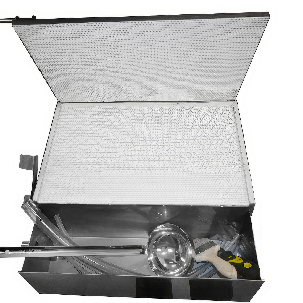 Zintegrowane chłodzenie wodne podłączone bezpośrednio do górnej części formy skraca czas twardnienia roztopionego wosku i umożliwia płynną pracę bez długiego oczekiwania. Silikonowa matryca tworzy precyzyjny odcisk komórek robotnic i jednocześnie ułatwia wyjęcie gotowej węzy – wosk nie przywiera do formy. Pojemnik ociekowy wychwytuje nadmiar, dzięki czemu na stanowisku pracy panuje porządek i nie dochodzi do niepotrzebnych strat cennego materiału.