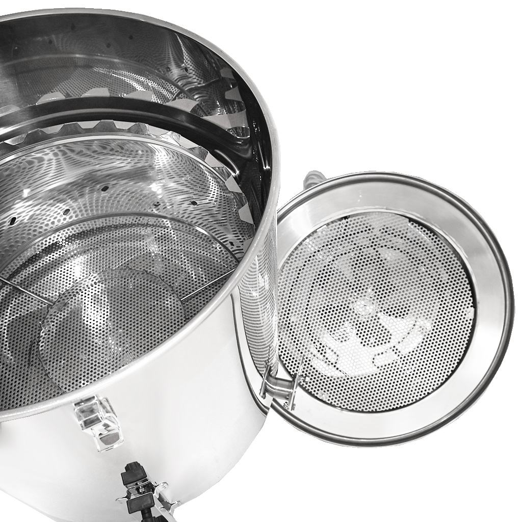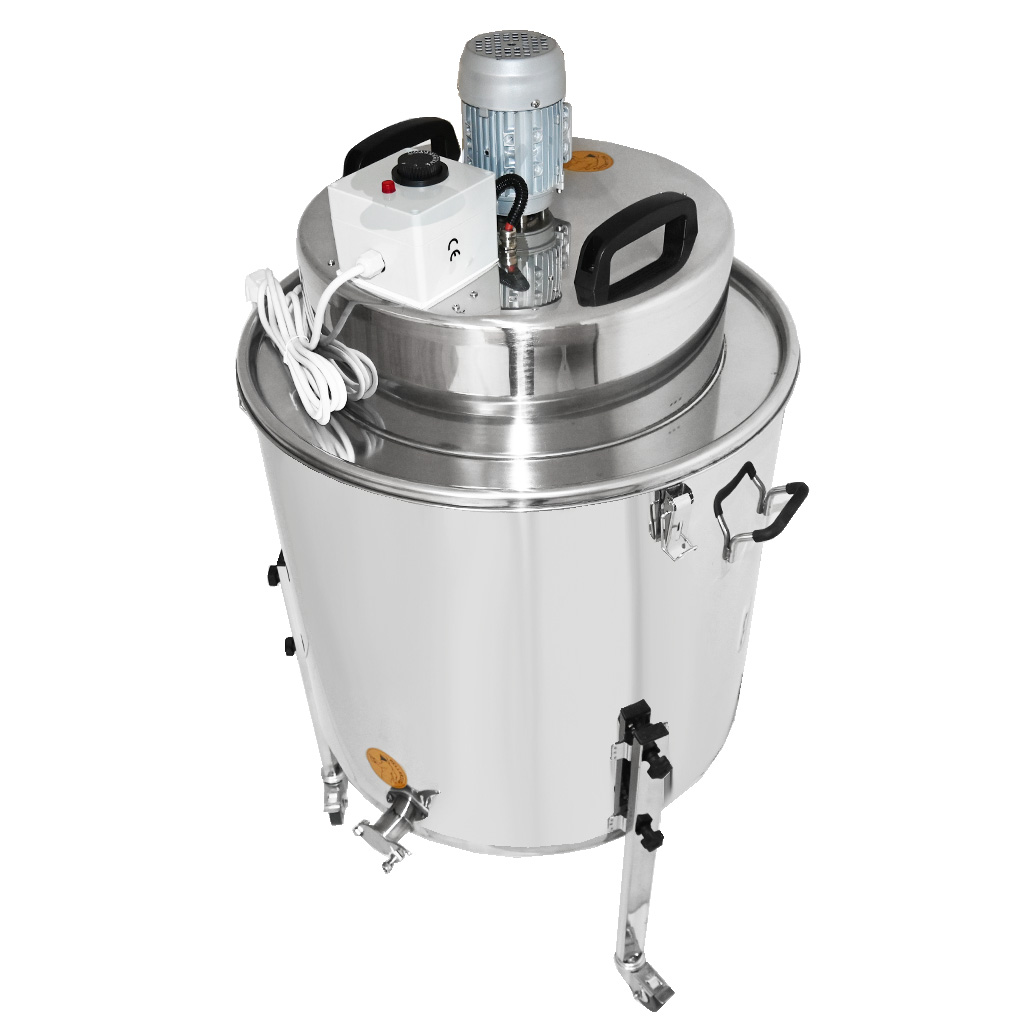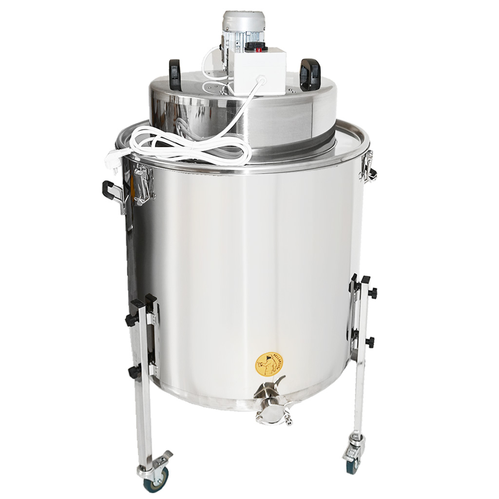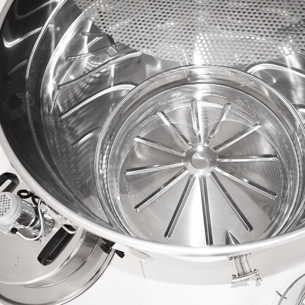 Dla maksymalnej wydajności zbiornik wykonany jest z pochylonym dnem i wylotem z zaworem dławiącym w najniższym punkcie, dzięki czemu pozostaje minimum resztek i wypływa nawet ostatni miód.