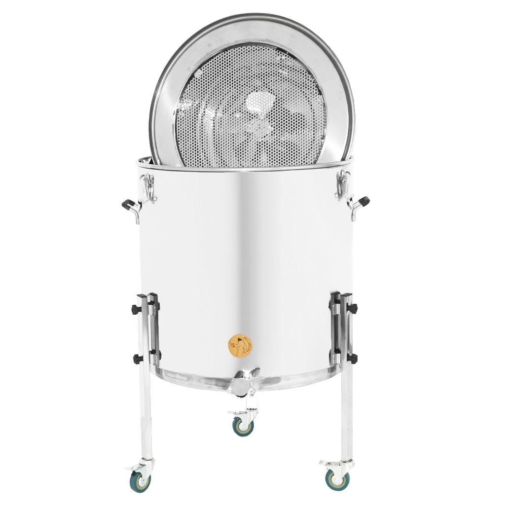 Mellarius to nie tylko separator wieczek. Dzięki przemyślanej konstrukcji wykonuje trzy zadania w jednym: funkcjonuje jako woskownica, separator miodu od wieczek, a jednocześnie jako pojemna komora do rozpuszczania. Z wewnętrzną średnicą 64 cm i wewnętrzną wysokością 71 cm do zbiornika łatwo włożycie większe pojemniki (wiadra) lub słoiki ze skrystalizowanym miodem.