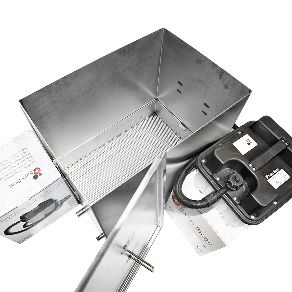 Obsługa jest prosta. Kosz napełnij całymi ramkami lub wyciętymi plastrami (przy wyciętym wosku dawkuj mniejsze ilości, aby masa się nie zlepiła i nie przeszkadzała w przepływie pary). Załóż pokrywę i włącz oba wytwarzacze. Gdy wosk zacznie wyciekać, pozwól procesowi trwać aż do momentu, gdy wosk przestanie płynąć. Następnie wyjmij ramki, a resztki węzy jeszcze na gorąco łatwo zeskrob. Zalecamy wyczyszczenie sita również jeszcze na gorąco, gdy resztki najłatwiej się usuwają.