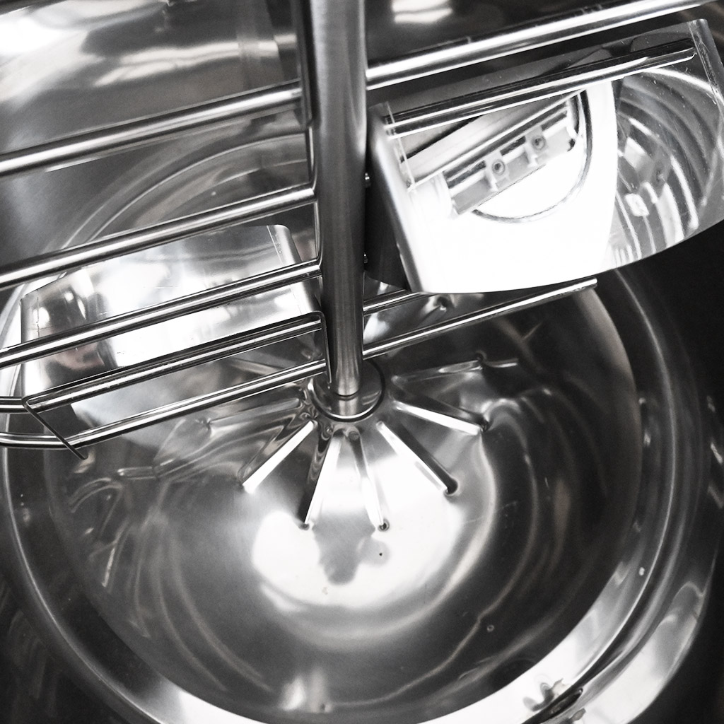 Konstrukcja uwzględnia również szybki demontaż do mycia: listwę mieszającą i wydajny silnik elektryczny (750 W) można łatwo zdemontować odkręcając dwie śruby. Bezpieczną pracę wspiera zabezpieczenie w pokrywie oraz masywne nierdzewne uchwyty dla wygodnej obsługi.