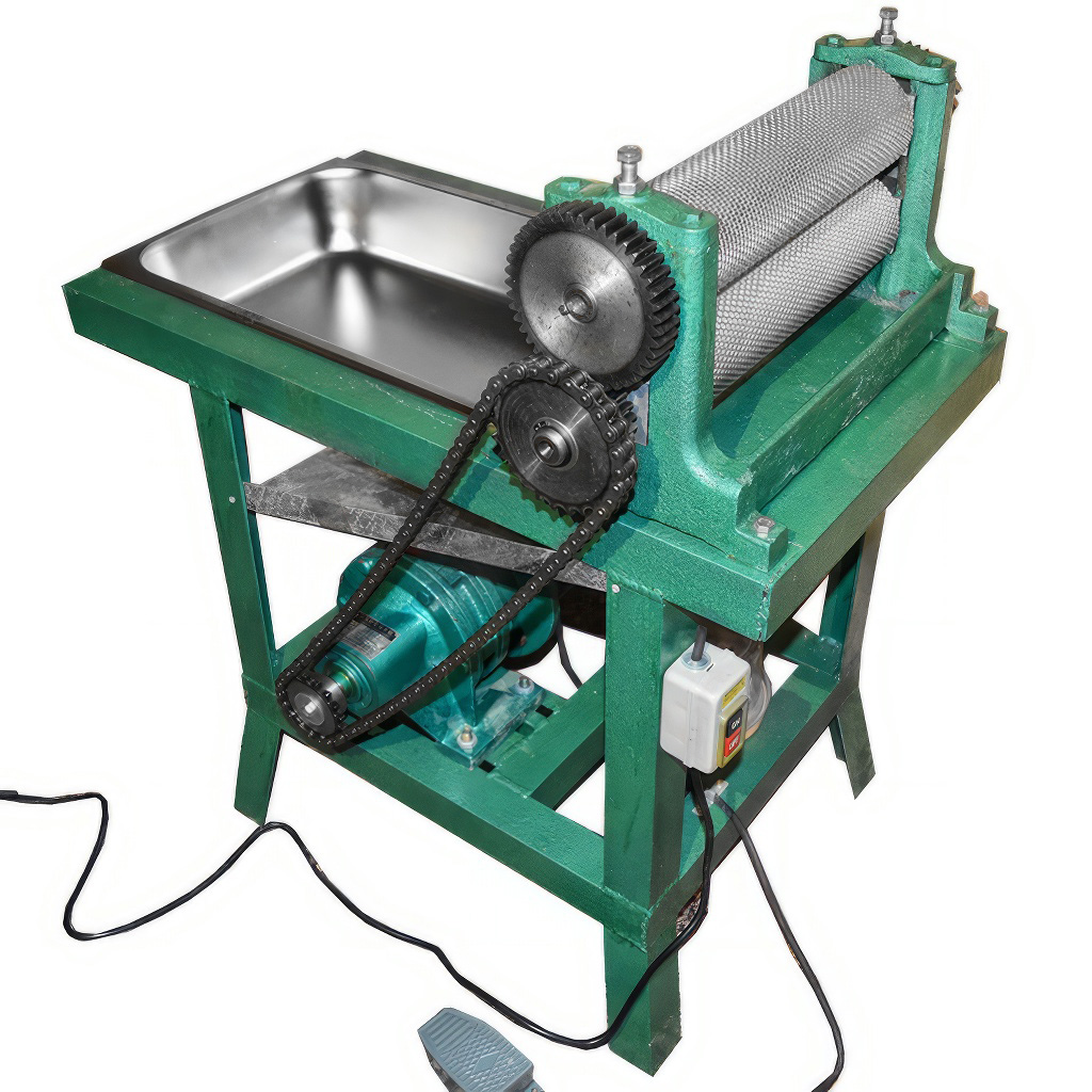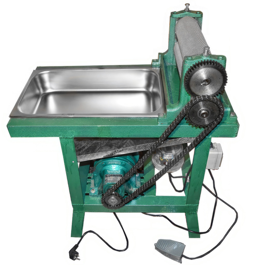 Część nośną stanowi masywna stalowa rama z kształtowników L (47 × 47 × 3 mm) z odpornym zielonym lakierem. Konstrukcja zapewnia stabilność podczas pracy i pomaga tłumić wibracje silnika. Dużym atutem dla wygodnej obsługi jest pedał nożny, którym łatwo uruchamiasz i zatrzymujesz walce – ręce pozostają więc wolne do precyzyjnego prowadzenia pasa woskowego. Częścią maszyny są precyzyjnie grawerowane walce, które wytłaczają typową sześciokątną strukturę komórkową węzy.
