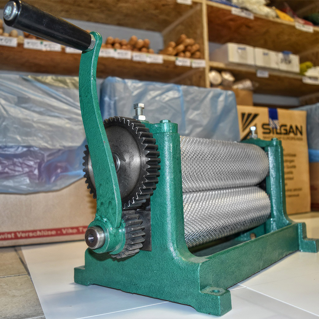 Produkcja zaczyna się od przygotowania płatów woskowych, które zalecamy przed wałkowaniem podgrzać w ciepłej wodzie, aby zmiękły i pozostały plastyczne. Nie zapomnij wcześniej zdezynfekować wosk poprzez gotowanie w temperaturze 117°C przez co najmniej jedną godzinę. Podczas samego wałkowania konieczne jest smarowanie lub spryskiwanie walców środkiem antyadhezyjnym, aby wosk się nie kleił. Możesz użyć na przykład serwatki, emulsji mydła szarego, emulsji z mydła dziecięcego lub delikatnego roztworu miodowego. Dzięki precyzyjnym śrubom rektyfikacyjnym można z dokładnością do dziesiątych części milimetra regulować grubość woskowej węzy dokładnie według Twoich potrzeb.