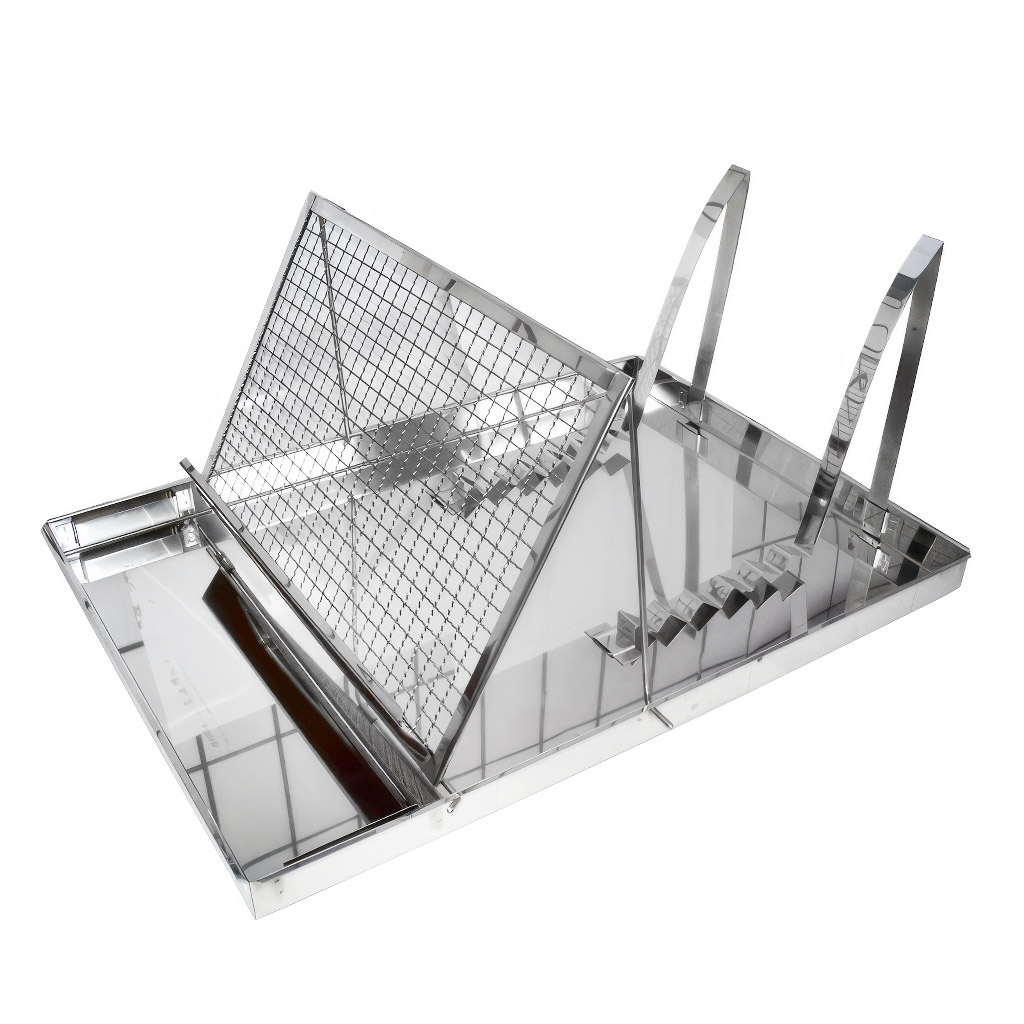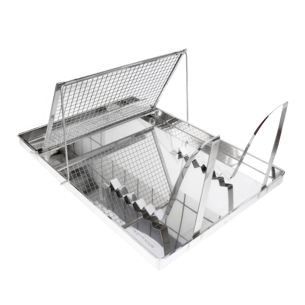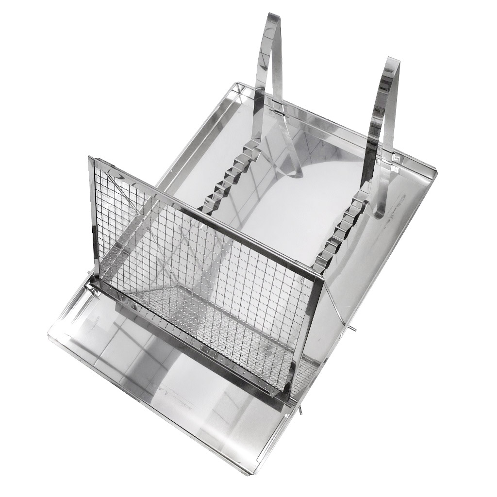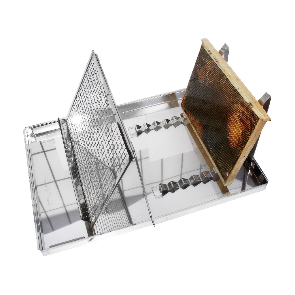 Talerz stanowi pojemne prostokątne naczynie osadzone na stabilnym stojaku. Wewnątrz znajdziecie wyjmowaną kratkę do odsklepiania oraz uchwyt do odkładania gotowych ramek. Wysokość 40 cm jest zaprojektowana tak, aby wygodnie pracować z talerzem na stole lub stanowisku roboczym.